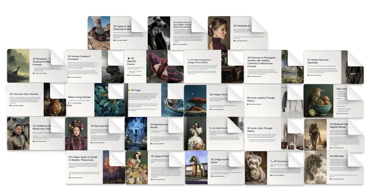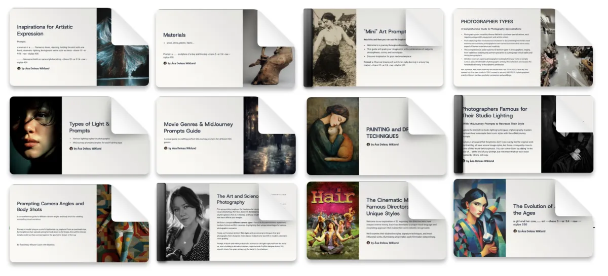14 PDFs packed with inspiration: photography history, art styles, camera angles, lighting setups, film genres, materials, and so much more – all designed to spark your creativity. Everything is illustrated and comes with ready-to-use prompts.