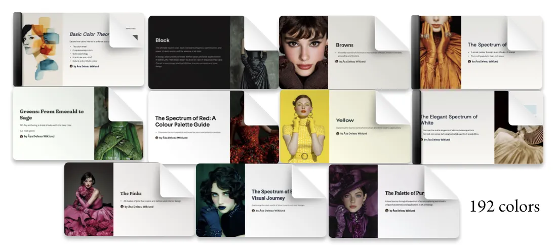 11 PDFs featuring 192 different colors so you can prompt exact tones. I even discovered new favorites myself during the process! Each color is illustrated with examples on both a model and a car to show how MidJourney interprets them.
